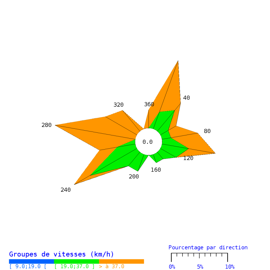 On a relevé 10 jours de vents forts (>= 58 km/h, 31 nœuds (kts)).